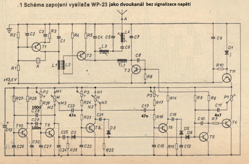 Přikládám schéma mého TX WP-23 (mohlo mě napadnout, že to každý nenosí 24 hodin v hlavě jako já), upravil jsem si ho pro max. zjednodušení jako 2-kanál a taky jsem vypustil signalizaci napětí - tu mohu vždycky doplnit na samostatné destičce.