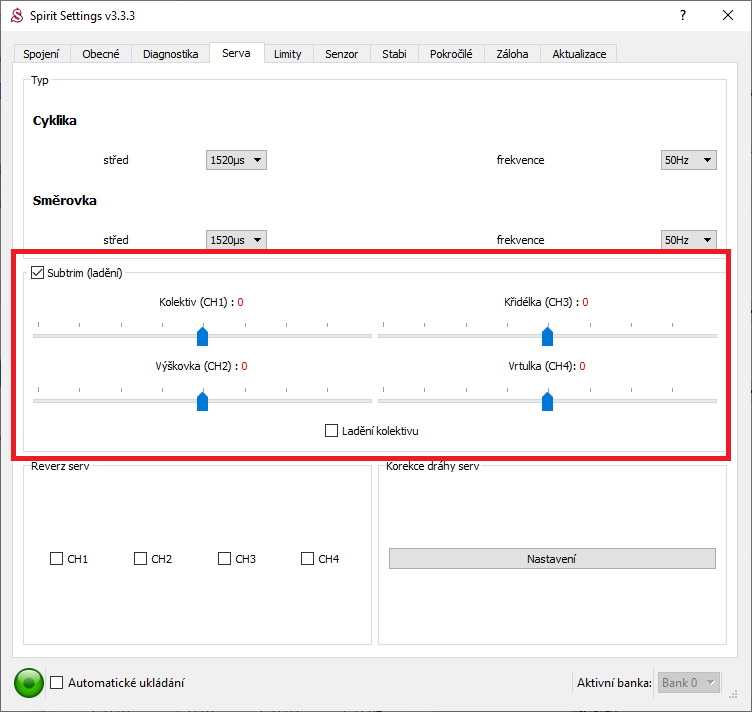Moc děkuji, když jsem vše ve vysílači vynuloval a začal s novým modelem, tak v diagnostice Spiritu jsou hodnoty výchylek v neutrálu při středové poloze pák.