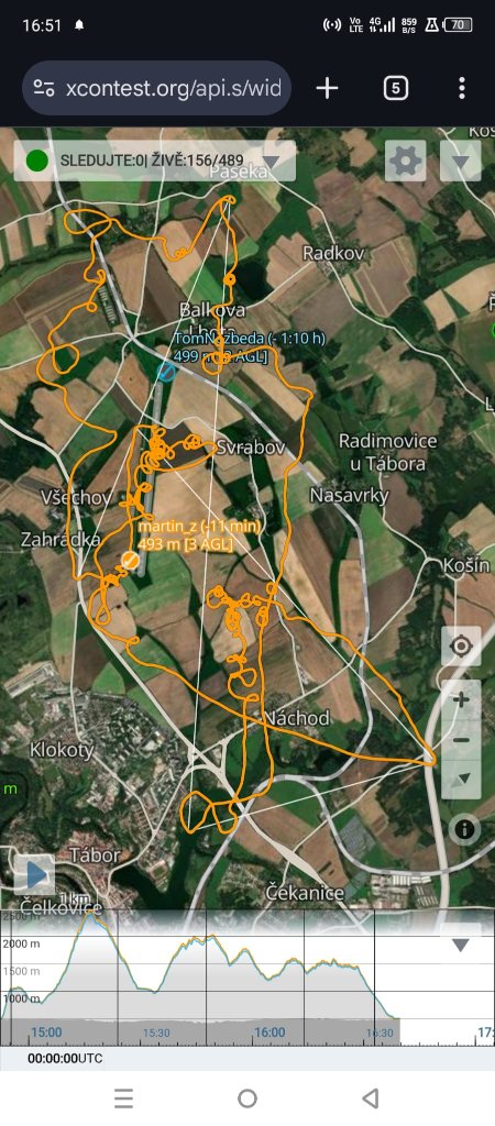Co se týče možností jak zlepšit u RC paraglidingu jeho největší slabinu, tedy nedostatečnou pronikavost proti větru, tak v tom jsem trochu skeptický. Ani u "velkých" to není žádná extra liga. Když fouká vítr 5m/s a víc, tak je jasnou volbou letět přelet jako záfuk, s větrem v zádech. Ti nejlepší doletí od Tábora až někam ke Znojmu, ten nejlepší doletěl letos až za Prostějov (199,56 km). Když je vítr mírný 1-3 m/s, tak se létají trojúhelníky, pokud možno s návratem zpět na start a pokud možno rovnoramenné (FAI). Tady má let proti větru nějaký smysl a není to šourání rychlostí chůze. To jsou ti "orli" kteří startují už okolo 11 h dopoledne aby měli co nejdelší termické okno a mohli být ve vzduchu až do podvečera. Podle aktuálních podmínek pak nekteré rameno trojúhelníku i natahují a někdy to přepálí a třeba nedoletí o pár kilometrů. Takže taktické rozhodování a příp. i určité riskování v průběhu letu je během těch cca 6-9 hodin letu rozhodně provází. Ne všichni mají livetracking zapnutý, ale nás kdo to zapínáme můžete sledovat v pohodlí domova na https://www.xcontest.org/api.s/widget/live-map/all/ a když si na konkrétního pilota kliknete a zaškrtnete v okénku, tak se zobrazí jak trasa tak výškový průběh právě probíhajícího letu. Proto jsem taky viděl, že konkrétní pilot mi přistává za domem, místo nedělního lítání jsem ležel s rýmičkou doma na gauči s mobilem v ruce.