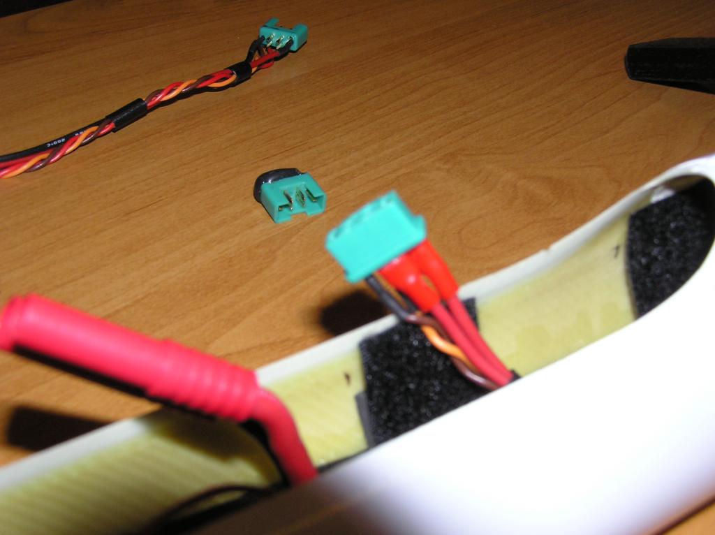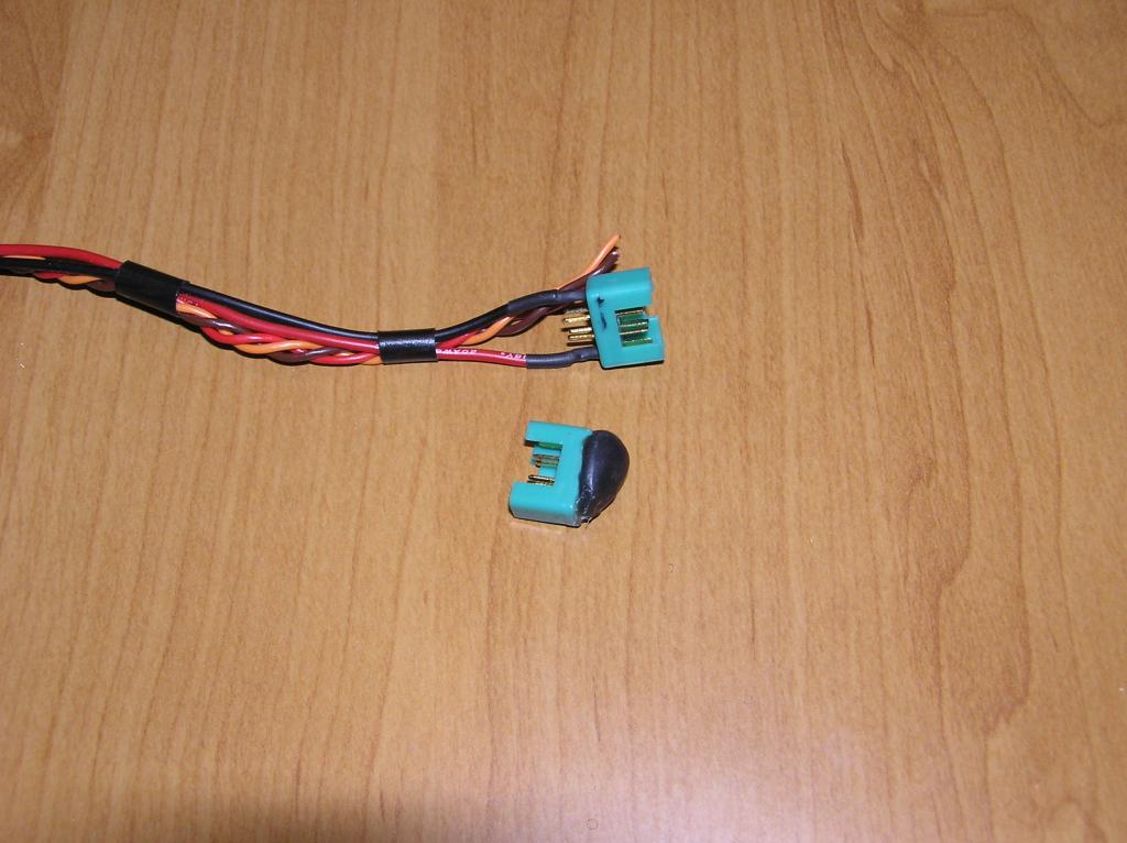 jeden pin konektoru - pol (jen nabíjení), jeden pin balanční (prostřední vývod z baterie), čtyři piny konektoru MPX + pol (zdvojené).