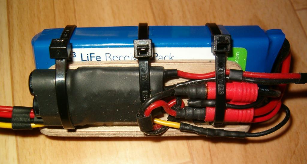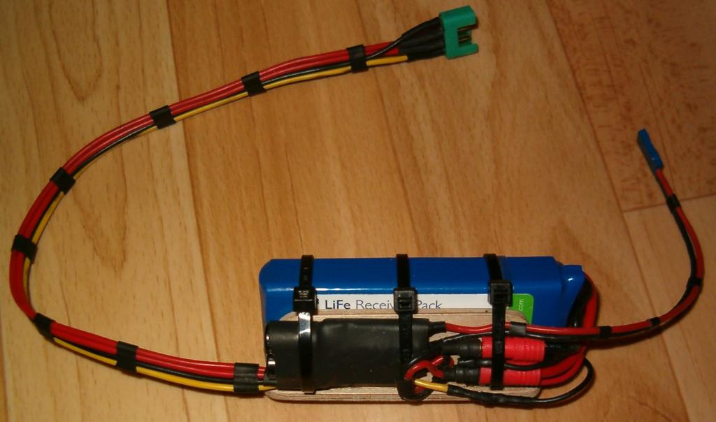 Po 3denním laborování a bastlení mi konečně vypadlo z rukou to co jsem potřeboval, tedy napájení pro palubní systém ENJOY. Původní 4čl. NimH ENELOOP 2000 s kabeláží a vypínačem vážil 125g. Já jsem na 115g s 2čl. LiFe Po4 1450mAh FLAT plus diodový omezovač a montážní rám do trupu. Vypínání je přez MPX konektor, kde jsou zdvojené kontakty pro vypínání plus - pól a střední balanční z baterky. Rozpojuji to mezi baterkou a omezovačem, tak abych se vyhnul možným diskutovaným problémům s vybíjením baterky, jelikož mám na výstupu 2x kondenzátor 470 mikro ESR.