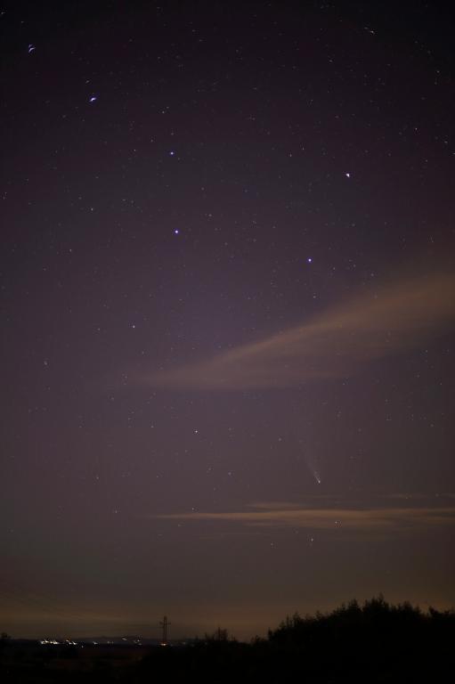 V Klecanech se bambi vak proletěl pouze na sucho a nízký odhoz z modré verze, se žlutou jsem odhodil asi ze 40-50 metrů tři litry vody v kanystru nějakých 30 metrů od nás do pole. Lítalo se až do tmy, poslední start před desátou a pak už čekání na kometu. Nakonec jsem ji vyfotil až po jedné hodině za Černovičkama, podmínky se už s každým dnem horší a ještě je k tomu dost oblačno.