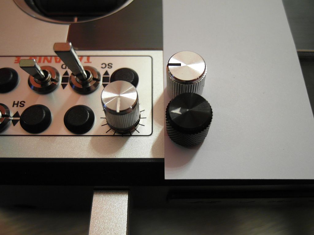 Vypadá to s těmi knoflíky pěkně, ale ty původní jsou taky hliníkové. Jsou jen naeloxované. Stačí je na pár sekund ponořit do 20% Hydroxidu sodného a výsledek je stejný.