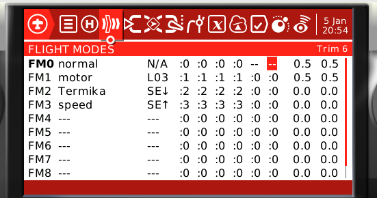 V prvom rade treba vypnúť pípanie trimu T6. To sa dá urobiť tak, že v menu Letových režimov vojdeme na riadok FM0 a pre trim T6 zmeníme hodnotu z 0 na --- (tri pomlčky)...