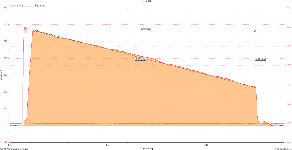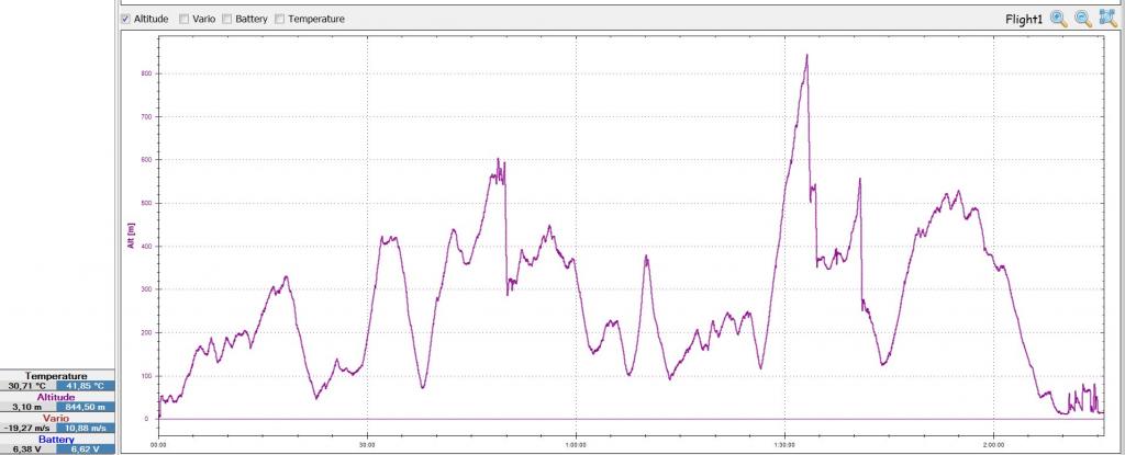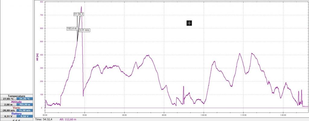 Na posledni let jsem si nechal maly pokus - vystoupat relativne hodne vysoko (kam ani pri zavodech nepolezu) a nechat to co nejdele bez zasahu letet "samo". Uplne do toho sahat jsem nemel nervy - obcas uz to bylo dost daleko, takze lehke korekce smerovkou tam jsou. Ale vysledek viz. graf - ne nadarmo se rika, ze ero leti nejlepe samo, kdyz do toho clovek nesaha