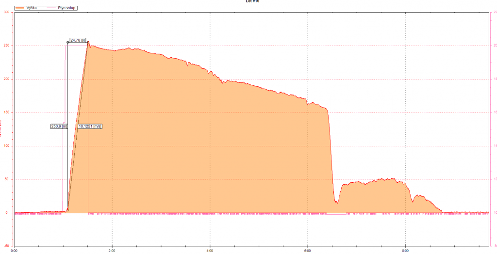 Let byl dneska v podvecer, pri lehkem vetriku cca 1.5m/s a pomerne slusnem vzduchu. "Vypinaci" vyska byla 288m, letovka 1650g.