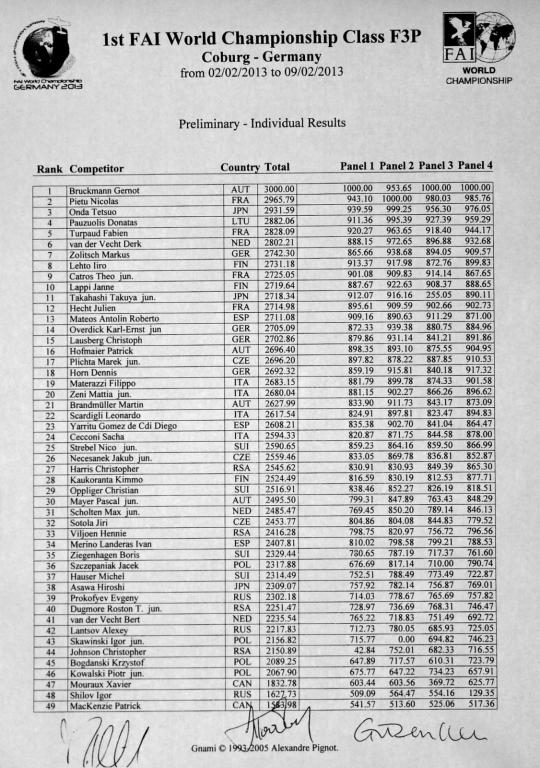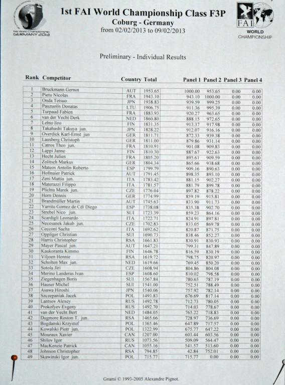 ahoj trenére tak první dvě kola jsou za námi, vypadá to že vede Gernot B, při druhém letu mu nasypali tak, že koukal i on a společně jme se divili kolik mu dali ... výsledky se přepočítávají na průměrnou hodnotu od všech pěti bodovačů, jsou dvě směny bodovačů tedy celkem dest. Výsledky se po skončení obou kol přepočítají algoritmem TBL ( má eliminovat protěžování a poškozování). Bruckmann starší konstatoval, že to s jako můžeme pak všichni divit. Nicméně GB má body zatím cca 315 a 325, Marek 291 a 293, Kuba 290 a 271, Jirka 265 a 262. Němci byli v prvním kole pod Márou, tedy horší, stejně tak holanďani, skvěle letí mladí finové a japonci taky, nicměně to jsou zatím úvahy protože výsledky jsou přeběžné a němci i holanďani teď právě letí.....