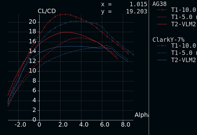 Je vidět, že třeba maximum CL/CD v tom prvním režimu má AG-38 okolo 18, zatímco zmenšený Clark-Y okolo 15, čili 83 % původní hodnoty. To bych bral jako rozumný odhad toho, co tak nejvíc lze pokazit nepřesným profilem.