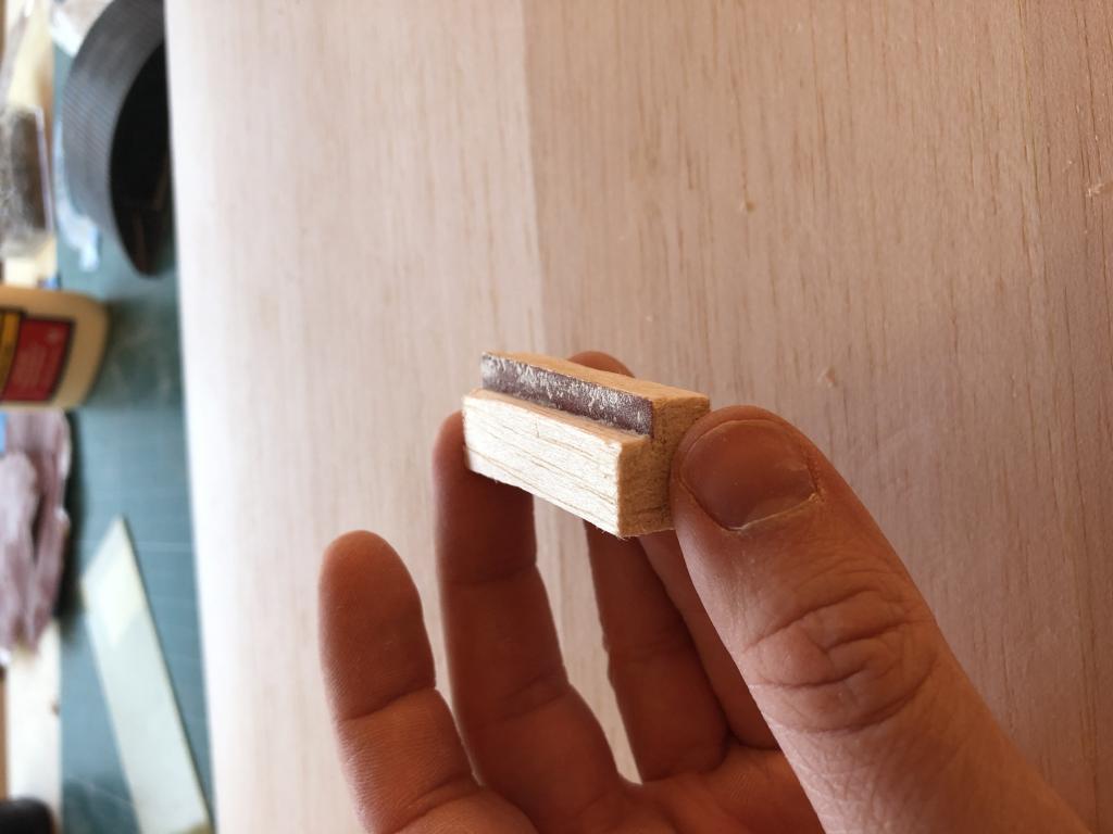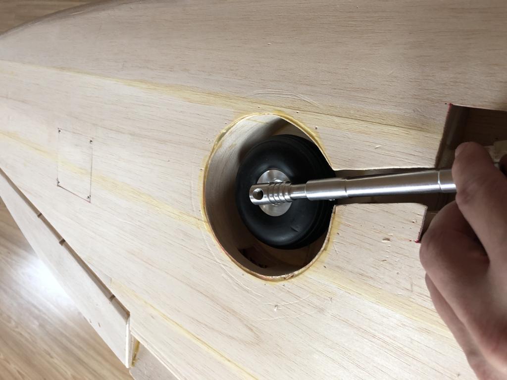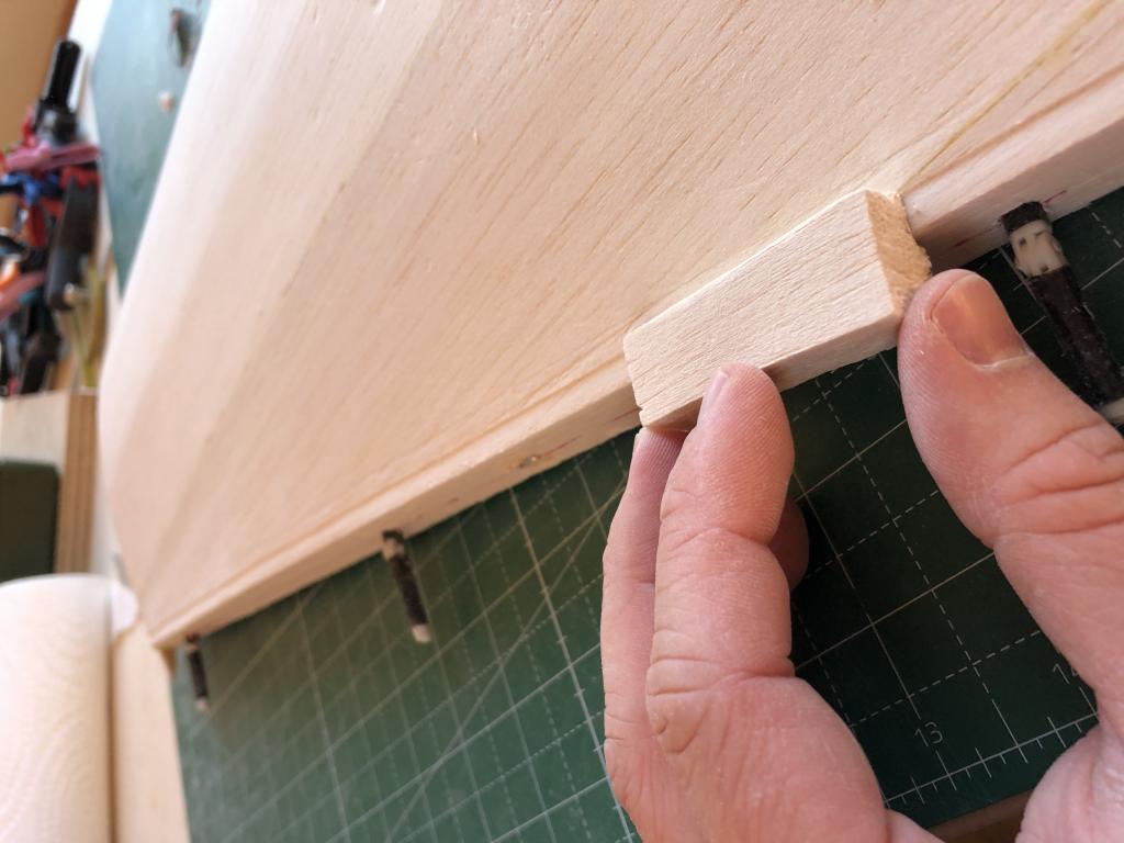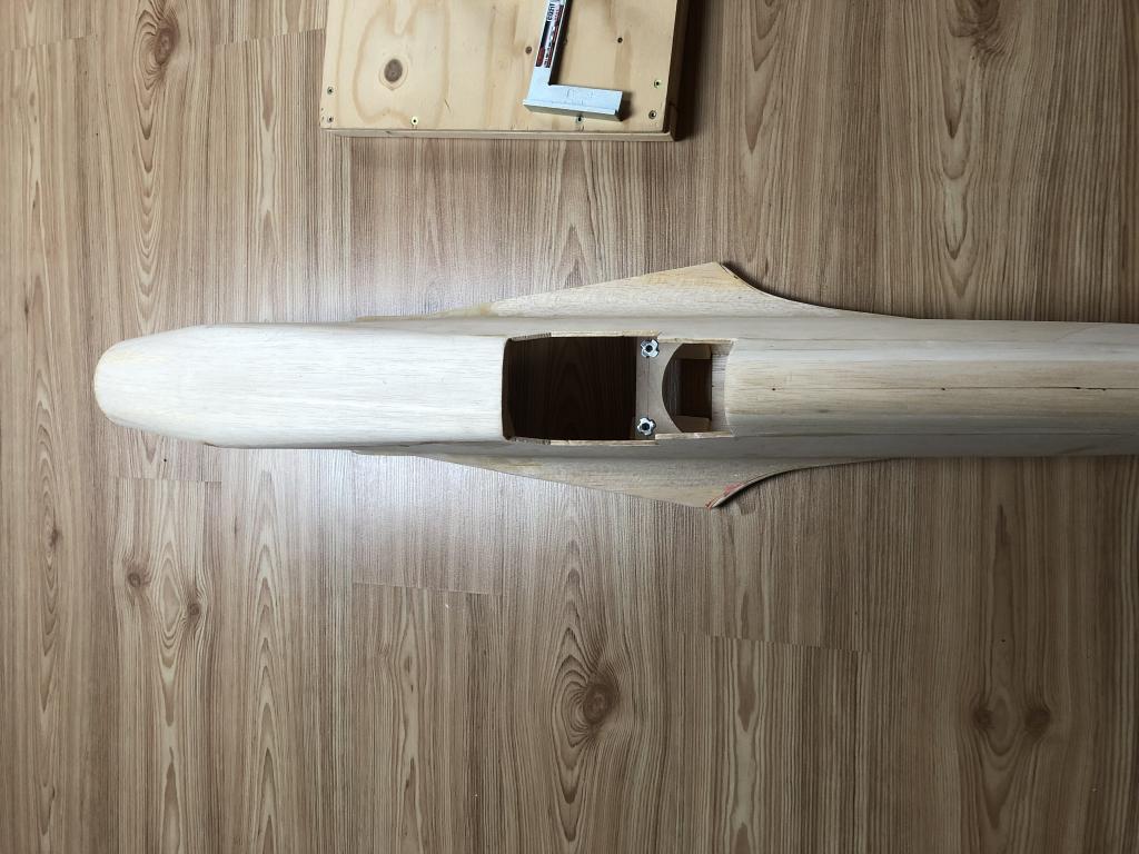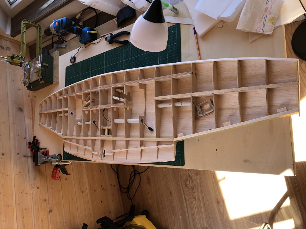 Dnes jsem upevňoval křídlo. Překližka na zápustné matice má 9 mm a byl to takový kosočtverec. V rámci šetření hmotnosti jsem z ní vyřezal kus oblouku. Úspora 27 g se počítá.
