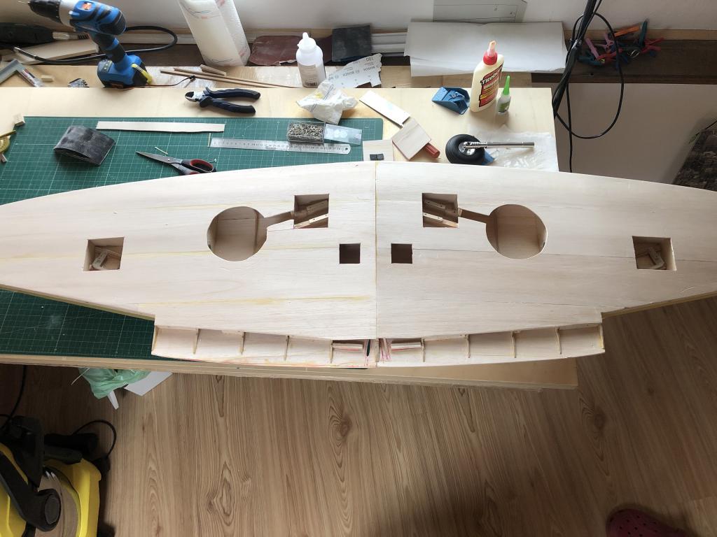 Nasledovala kompletace křídel a potažení spodní strany balzou. Na druhý den jsem vyřezal do spodní strany servisní otvory a otvory pro kola. Byl jsem však moc hrr, a otvory pod podvozkovým mechanizmem patří na vrchní stranu, takže jsem je musel znovu zalepit.