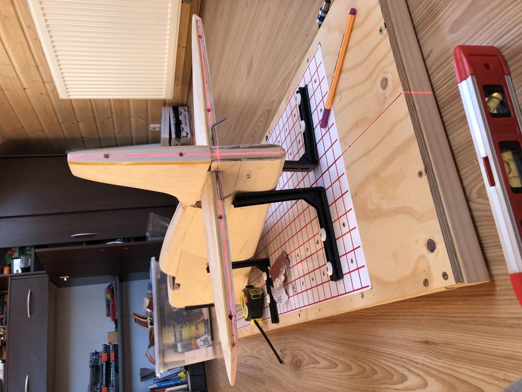 Po upevnění následovalo další přeměření laserem polohy křídla vzhledem na ocas. Vše sedí a navíc letadlo už má svůj tvar! Dnes už se budu jen kochat.