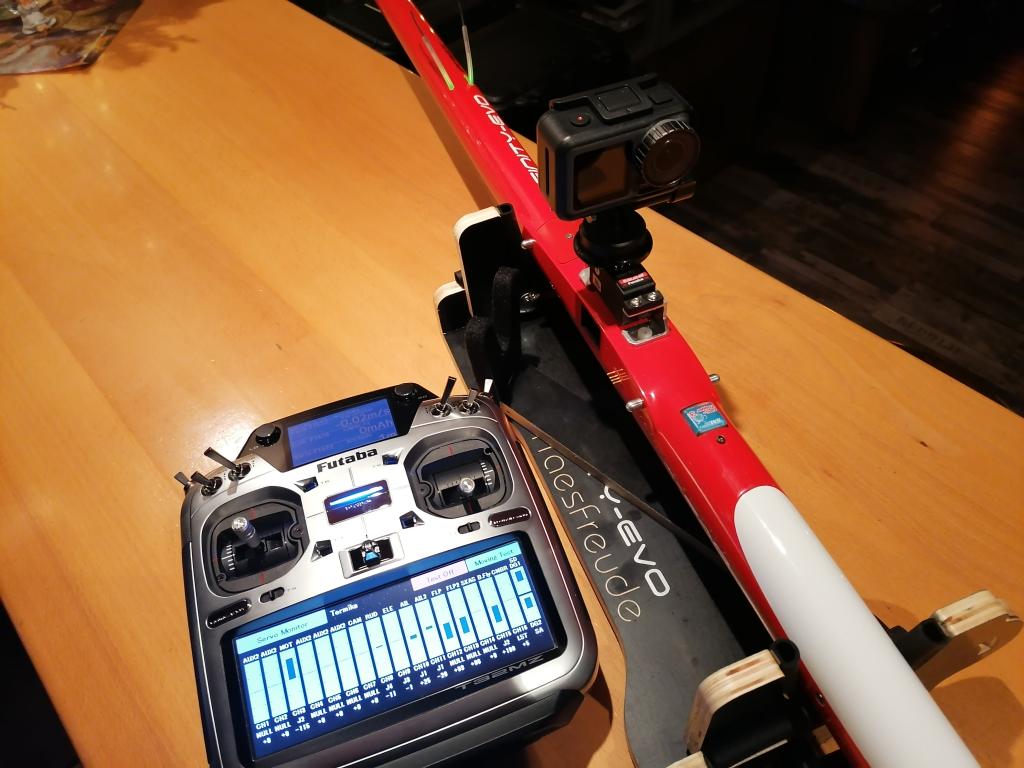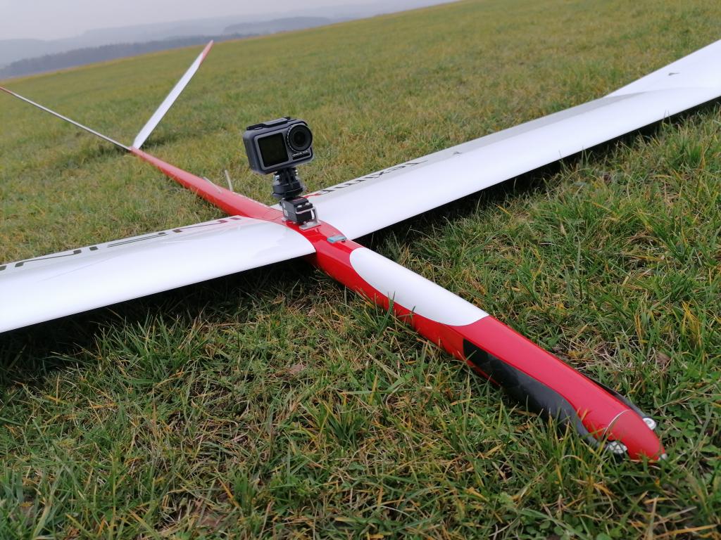 Na letní a Alpské létání a natáčení připravuji držák kamery DJI OSMO Action. Kamera pujde za letu natáčet servem .