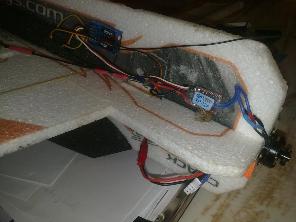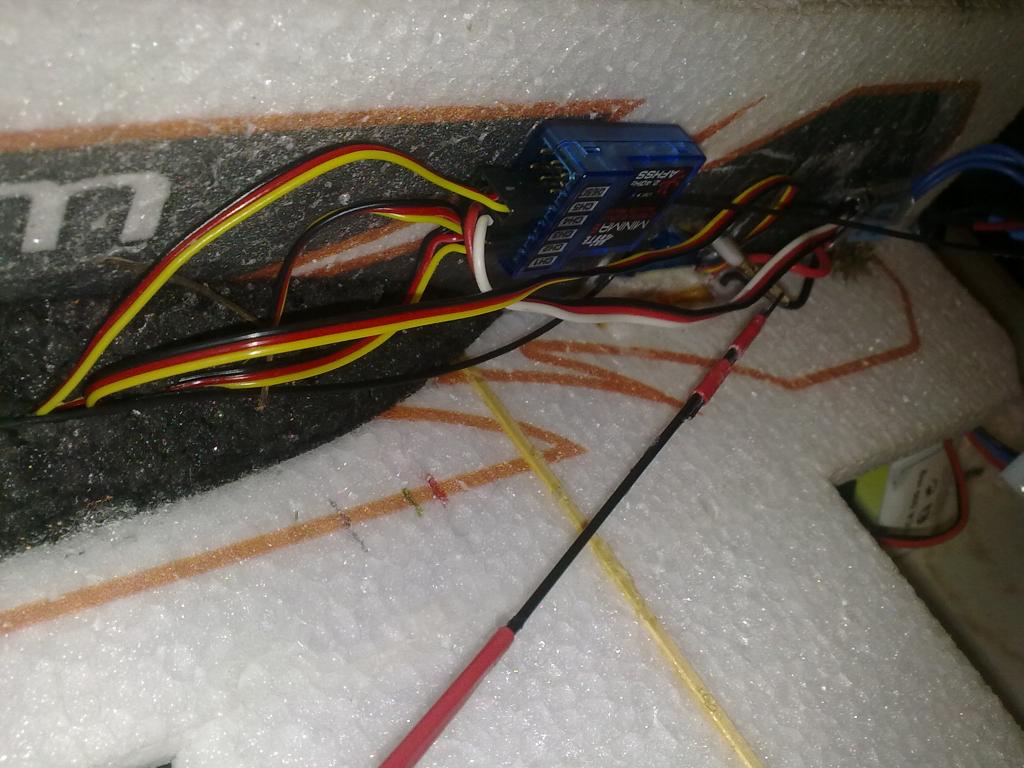 Tych roznych drotov je pomerne dost. Trochu zavadza druhy fuz z anteny prijmaca Hitec. Cast drotov som ulozil aj do zarezu sikmej bocnej (ciernej vyztuhy trupu. Sam nie som velmi spokojny s organizovatnostou tych drotov.