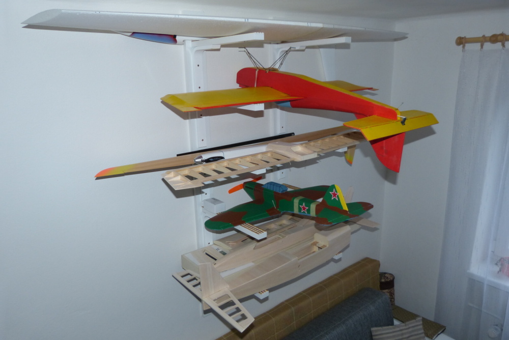 Máš pravdu. Žena mne už sprdla, proč jsem ty konstrukce na zeď neudělal rovnou 2x. Krámy mám po skříňkách, co do pokoje vybrala žena. Děti už nemáme a tak je to naše pracovna a nebo návštěvy na přespání. Takže ve sklepě řežu, lepím, stavím a doma uskladňuji, nabíjím, nažehluji a mám tu veškerou elektroniku a dokumentaci. Zatím tu mám 5 modelů, další teď stavím a + dvě stavebnice výřezy.