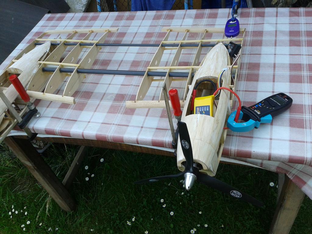 Vrtule třílist MA 13x8, odběr 47A při 15,5V na čtyřčlánku. Tah cca 2,7kg. Samozřejmě na jednom motoru. To prozatím stačí.