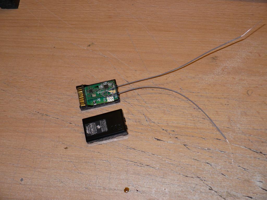 Já mám v Alcorovi jednu anténku uvnitř trupu, podélně s osou, co nejvíc vzadu. Poloha je přesně definovaná trubičkou zalepenou na spodku trupu, do které se anténa nasouvá při montáži přijímače. Druhá je venku, viz foto. Výhodou je, že lze bez problémů "uklidit" před zasunutím trupu do přepravního obalu. Akorát je vhodné nezapomenout ji vyndat zpět před dalším lítáním