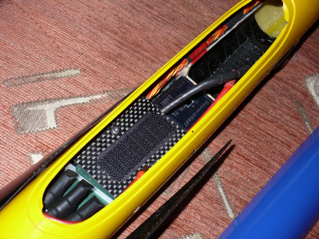Mně to vyšlo: motor, regulátor, pohonná baterie - v kabince, servo směrovky a přijímač a nakonec těsně před pouzdrem spojky křídla přijímačová baterie. A ta se musí dát nabíjet bez vyjmutí, proto těch drátů je tam víc.