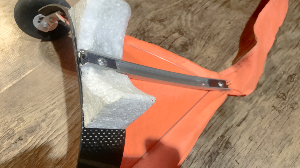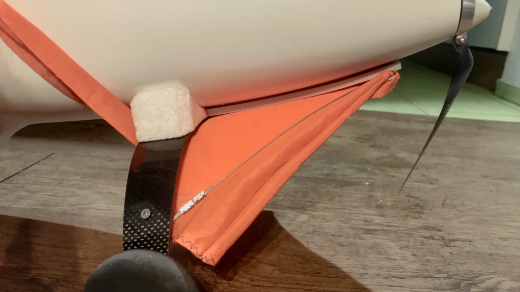 Zatím to nemám odzkoušené, tak to berte jen jako inspiraci---podvozek potuněný o cosi jako padák který mi nebude komplikovat zacvakávání podvozku, teoreticky by i mohl na šikmém čumáku modelu fungovat tím náběhem pro ten těžší čumák jako kachní křídlo--tedy kompenzovat ten těžší čumák a z výšky by to snad i mohlo ten padající podvozek trochu přibrzdit, třeba jen rotováním---testovat to nebudu, až to přijde tak to přijde.