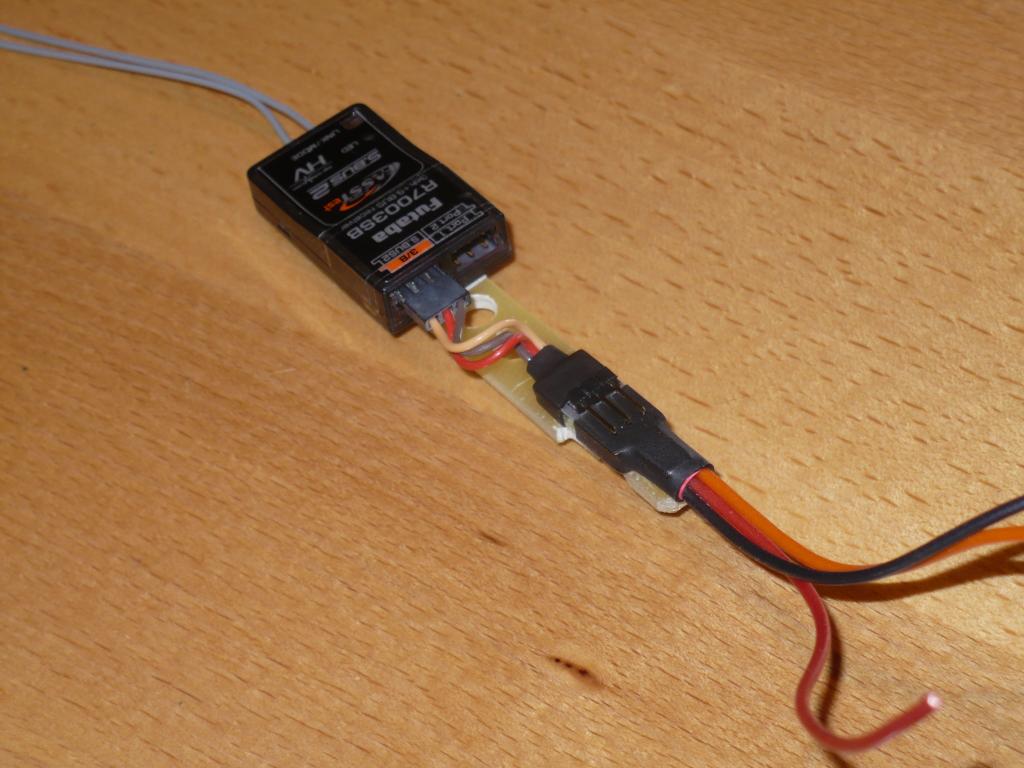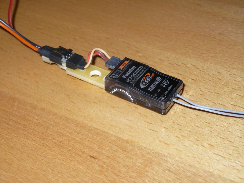 Add moje Corado. Nechtělo se mi kupovat další přijímač Futaba Fastest 7008SB, tak jsem se rozhodl,že křídlo už udělám na S-Bus. Doma se válel přijímač 7003SB a převodník S-Bus taky mám. Tak jsem si vyrobil takovou destičku která nese přijímač a můj HUB na připojení křídla a Sm-Unisens do lajny S-Bus2. Konektor do křídla ještě není hotový,zatím rozmýšlím,jak a kde to kuchnu :-)