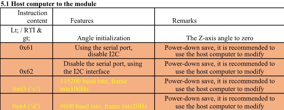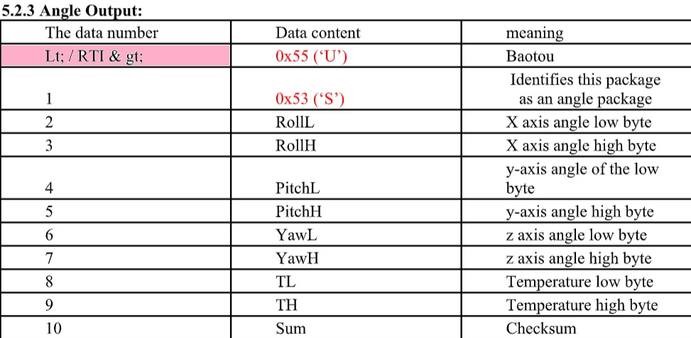 hodnoty naklonu 0x55 + 0x53 + RollH + RollL + PitchH + PitchL + YawH + YawL + TH + TL