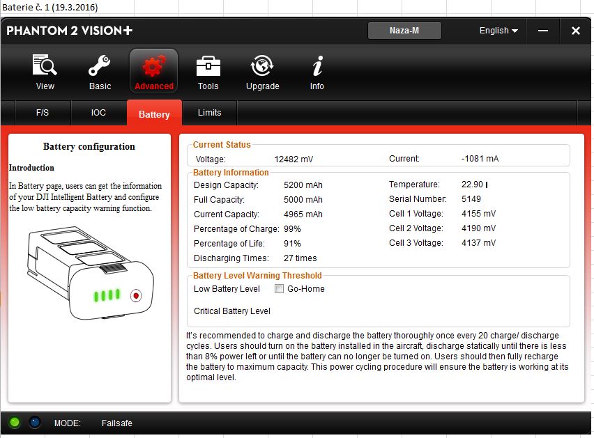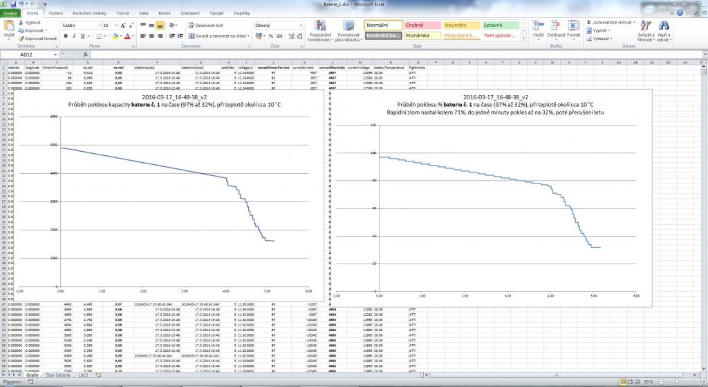 mám Phantoma 2 Vision + a u baterie č. 1 se mi ve čt stalo, že kapacita poklesla příliš rychle (výdrž max. 5 min). Naštěstí aplikace Litchi umí velmi dobře logovat, tak jsem si s tím trochu pohrál a hodil to do grafů. Myslíte, že je možné na základě těchto informací konkrétní baterku (č.1) vyreklamovat? Ano už od začátku byla trochu divná, ale tohle už graduje a celkem už se bojím na ni lítat. Budu nucet koupit novou, ale pokud by bylo možné ji vyreklamovat (poslat jen tu) bylo by to dobré. Jednu baterku jsem totiž kupoval navíc. Pro srovnání baterka č. 2 i při nižší teplotě se chová, tak jak by měla (víc než na 55% jsem u níc nešel - byla mi už příliš velká zima, abych létal dál), výdrž cca 10 min a ještě by šla dál. Jak se chovají (vydrží) baterky u vašich Phantomů?