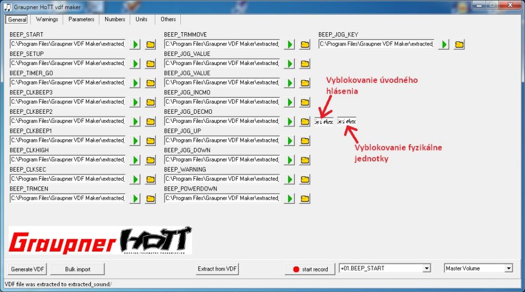Ťažko povedať, akú štruktúru má vdf súbor, ale je možné, že každému parametru je úvodná hláška a fyzikálna jednotka prideľovaná samostatne. Potom by sa mohol dať program Graupner_hott_vdf_maker modifikovať, aby sa aj pri každom parametri dal samostatne vyblokovať úvod, alebo fyz. jednotka, alebo obidvoje.