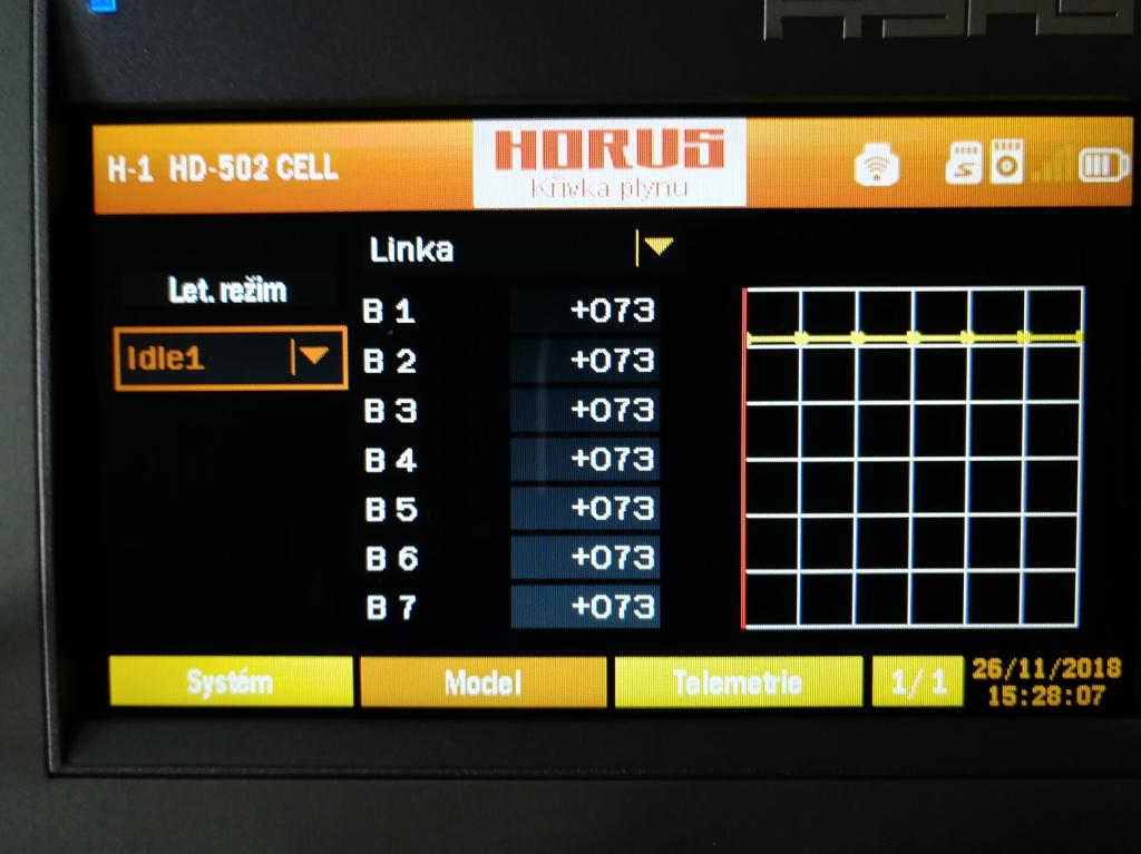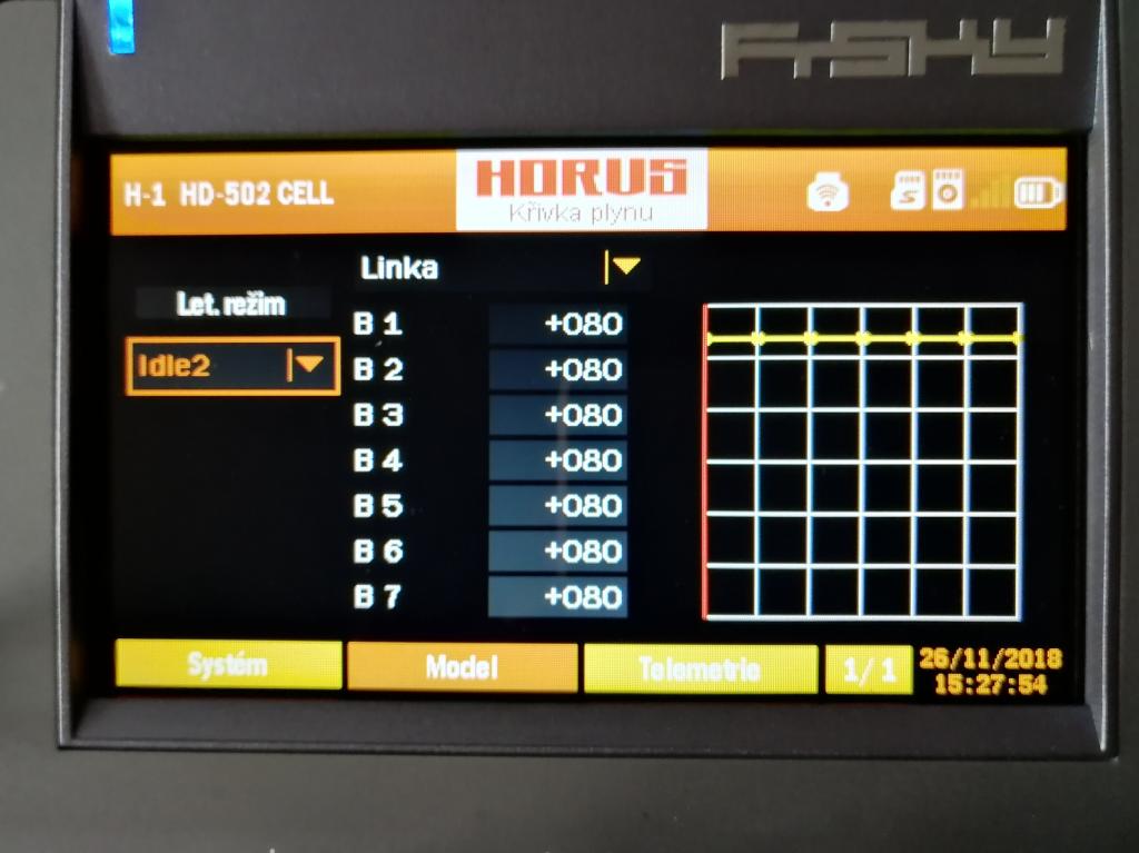 Co to je? To máš na jednom letovém režimu takhle nalámaný governor? To bude asi ta příčina přehřívání regulátoru.Žádné schody.Srovnej to do jedné roviny a prolítni.Pak dej vědět jestli to pomohlo.Pokud vím tak takhle governor nefunguje.Jestli požaduješ tři plyny,použij tři letové režimy a na každý jinou křivku plynu. V případě governoru všechny body v jedné rovině se stejnými hodnotami. Pro každý letový režim v jiné ůrovni.Nevím jak jsi tohle dokázal skloubit ještě s křivkou kolektivu ale asi není divu že to regulátor nerozdýchá.