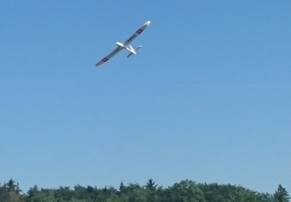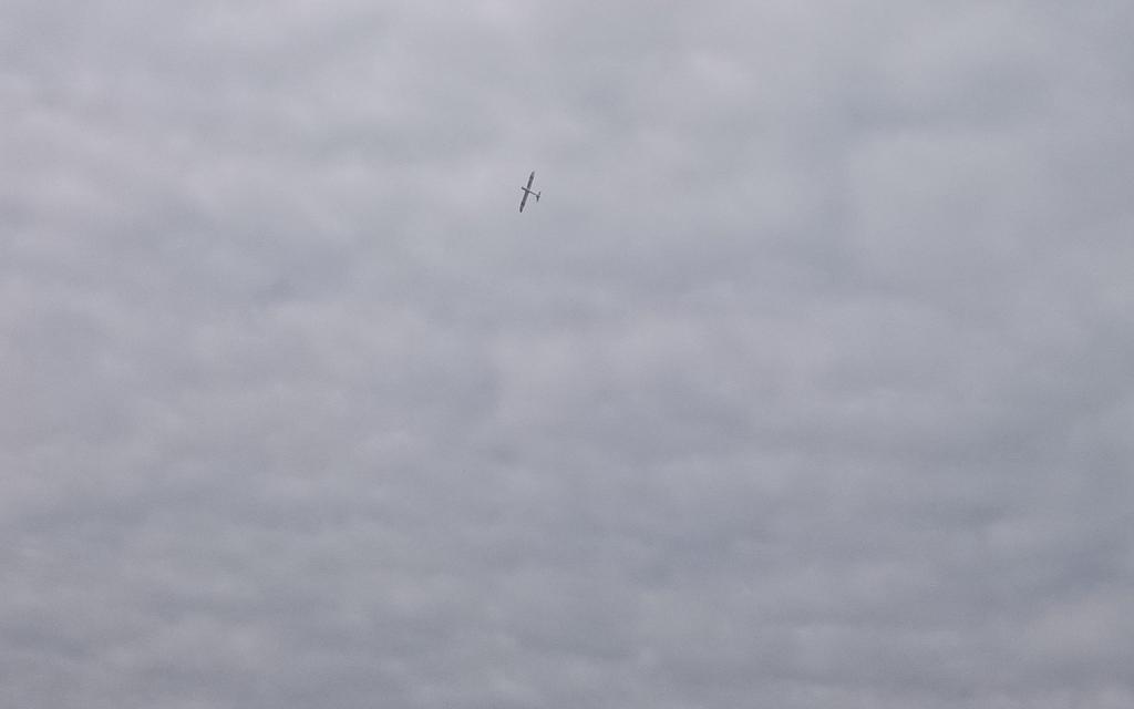 Já nelítám moc nad hlavou, takže v zatáčkách a ve vejšce opravdu jen mi občas bleskne bílej trup na obloze. Proto si nedovolím ho moc spouštět z oka. Pod mrakem vidím skoro celou siluetu jako šedý stín a je to v poho.