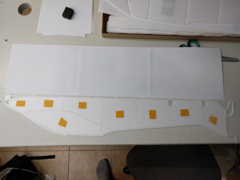 Výškovku a křídla potahuju v kuse. Seříznu pant, provizorně díly fixuju k sobě páskou ze spodní strany, nastříkám lepidlem a šup tam s nima.