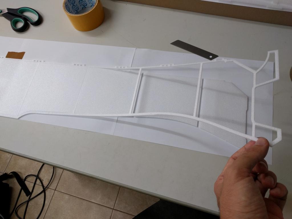 pozn2: pokud se nepovede nalepit pásek úplně rovně (aby jeho hrana byla zároveň s povrchem depronu), může to komplikovat potahování. Mylaru se pak na stole dotýká jen uhlík a depron nepřilne.