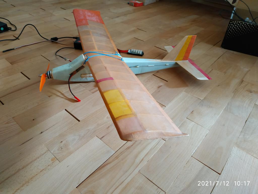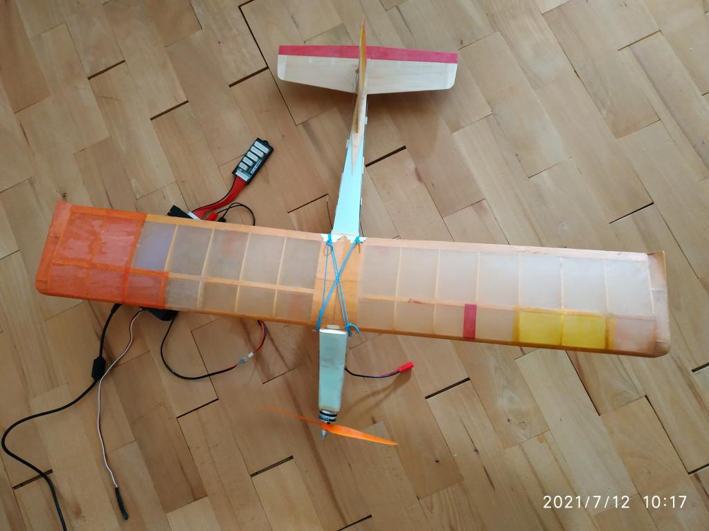 Tiež som chcel občas polietať z niečím malým. Doma mám od svojich 17 rokov model Tourist na CO² prerabka pôvodného trupu na elektro nepripadala v úvahu. Jediné čo som použil z pôvodného modelu sú krídla,proporcie trupu vyskovky a smerovky. Trup je z XPS, smerovka a vyškovka balza. Jediné čo by to chcelo, je doladiť vyosenie motora. Na plný plyn sa stáva na "zadné" Ak sa ulahodí plyn je to v pohode na kľudne poletovanie okolo hlavy aj trochu ďalej.
