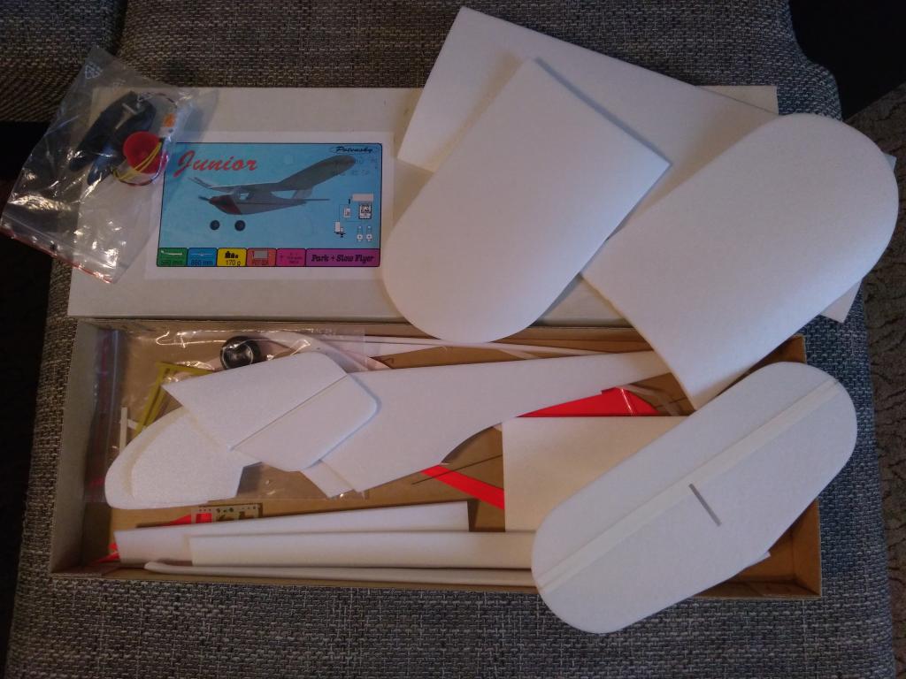 Jasně, je to "jen depron" a vybavení je dnes o notný kus dál (i táta má v Juniorovi už stříďák a malý 2článek, s váhou byl na 130g a model lítal úplně "jinak" než naložený NiCd packem) - ale není nad řehtající převodovku, což k tomu neodmyslytelně patří... (trochu bude problém s accu a voltáží pro pohony, ale o tom potom - třeba v tomto vláknu).