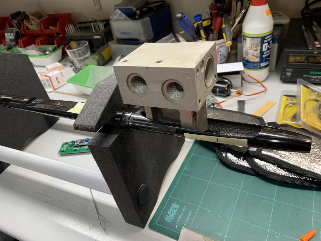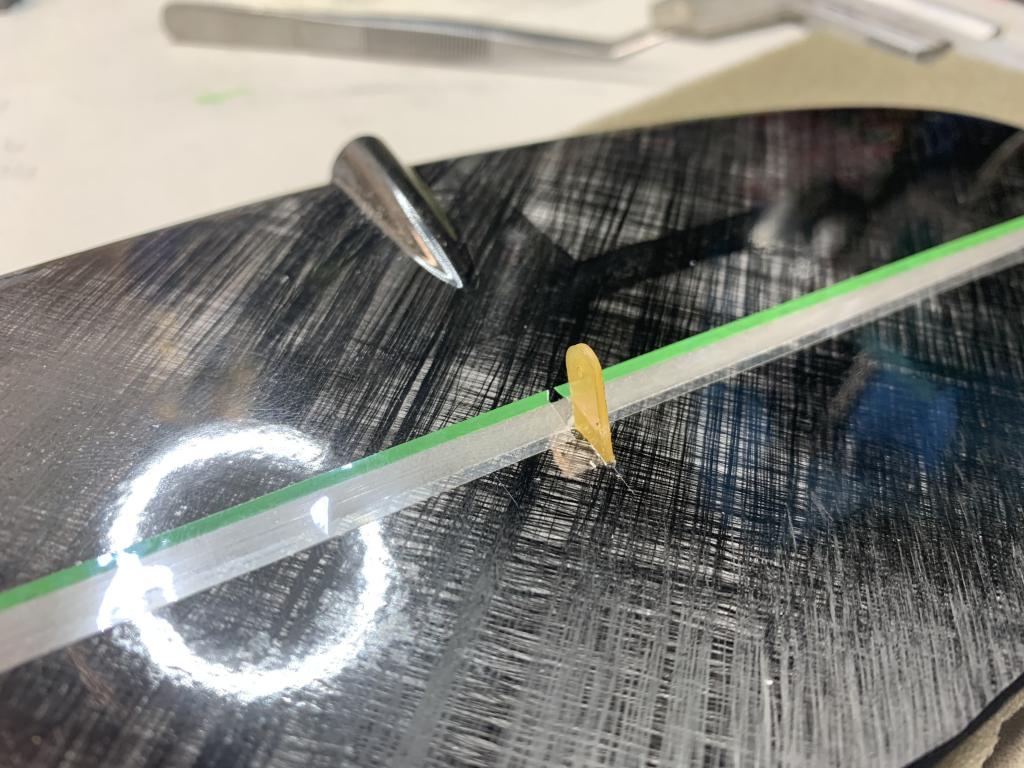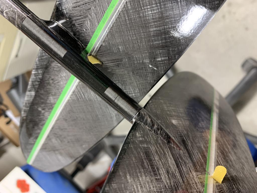 Lepím Epoxi L285, kterou zahušťuji mikrobavlnou a uhlíkovým prachem. Konzistence tekutého medu. Epoxi vpravuji jak do drážky v křídle, tak natírám na kolík. Do drážky to chce dát epoxidu trochu víc. Když vyteče, tak jej hned utírám. Konec křídla s kolíkem přes něco měkkého zatížím.