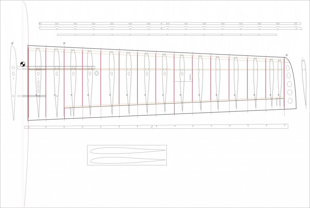 Takových křídel létá docela dost, ale já si chtěl vyzkoušet vlastní konstrukci. Při kreslení jsem počítal s lineárním zkroucením křídla počínajícím na třetím žebru od osy a hodnotou -3° na konci. To se na předchozích bezocasých modelech osvědčilo.