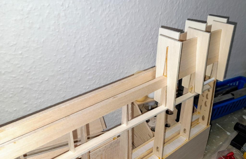 náběžka dává rozteče žebrům vepředu, podpěrná lišta zase vzadu. Ta při lepení zajišťuje také správné geometrické zkroucení křídla; používám ji dokud neuzavřu torzní skříň.