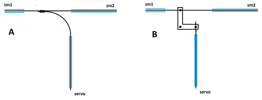 Ve vzduhu bude řízený křidélkama a výškovkou.Po zemi jsem udělal otočnou ostruhu ovladanou volním kanalem SOP.K variantě B , společné táhlo ovladane vahadlem ktere se pohybuje po kružnici potřebuje asi velkou vůli jinak se to táhlo bude asi kroutit.Možná se pletu...