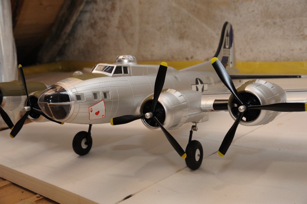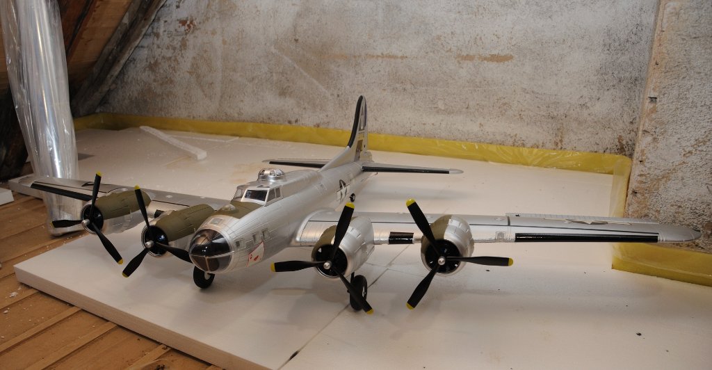Zkoušel jsem v (podle mě) dostatečné výšce nějaké "hraniční" manévry, kdy by mělo letadlo "vrtat", či padat po křídle, či podobné nehezké věci, co nechcete, aby se děly nízko nad zemí a nepodařilo se mi tuhle B-17 dostat do vývrtky a i když se "přetáhne", při letu nahoru zpomalí, tak nějak v klidu lehne a letí dál, po křídle nepadá. Jevilo se mi hodnější jak FunCub od Multiplexu, který si umí pěkně "zavrtat". Nejspíš ty 4 motory (co prakticky pořád běží) dělají svoje.