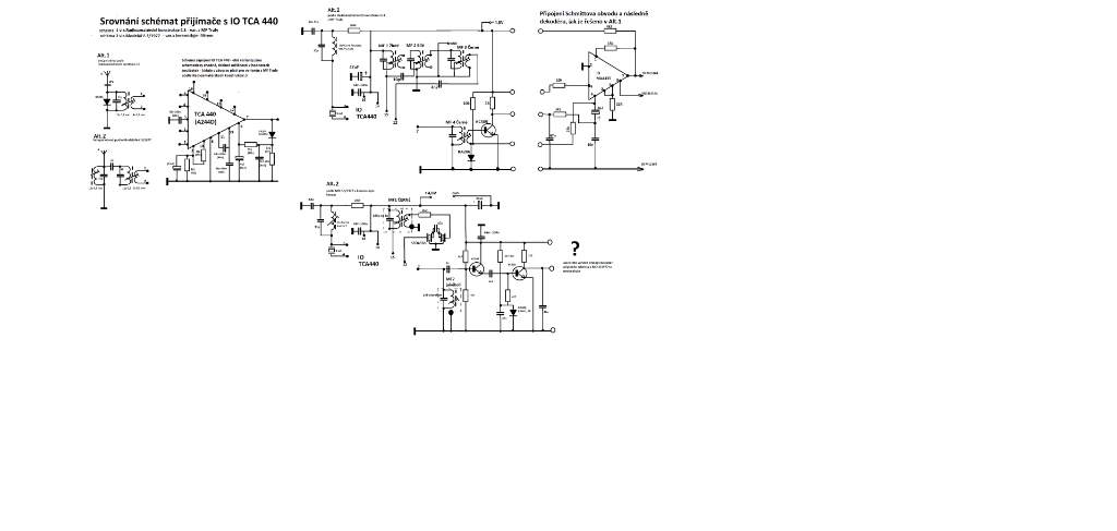 1) V knize Radioamatérské konstrukce č.3 je návod na stavbu tohoto přijímače, ale zapojení neobsahuje keramický filtr 455 kHz, namísto toho je v zapojení použitá třístupňová pásmová propust z mezifrekvenčních traf (Ž,B,Č). Myslím, že tímto řešením se tak trochu vytrácí efekt použití integrovaného obvodu TCA440 (který jinak obsahuje vf předzesilovač, směšovač, oscilátor a řízený mf zesilovač), přinejmenším narůstají rozměry a složitost jinak efektivního řešení, bohužel schéma zapojení přijímače s keramickým filtrem 455 kHz, jsem nikde nenašel. Zajímá mě Váš názor na rovnocennost obou řešení.